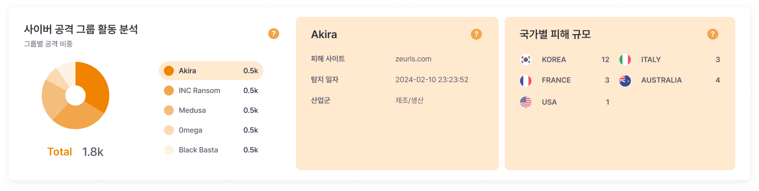 유출 정보의 심각도와 리스크 스코어(위험 점수)를 제공하며, 대응 추이와 피해 증감을 시각화합니다.