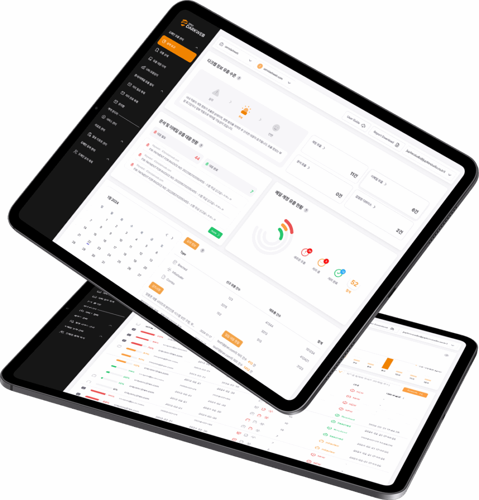 유출 정보의 심각도와 리스크 스코어(위험 점수)를 제공하며, 대응 추이와 피해 증감을 시각화합니다.